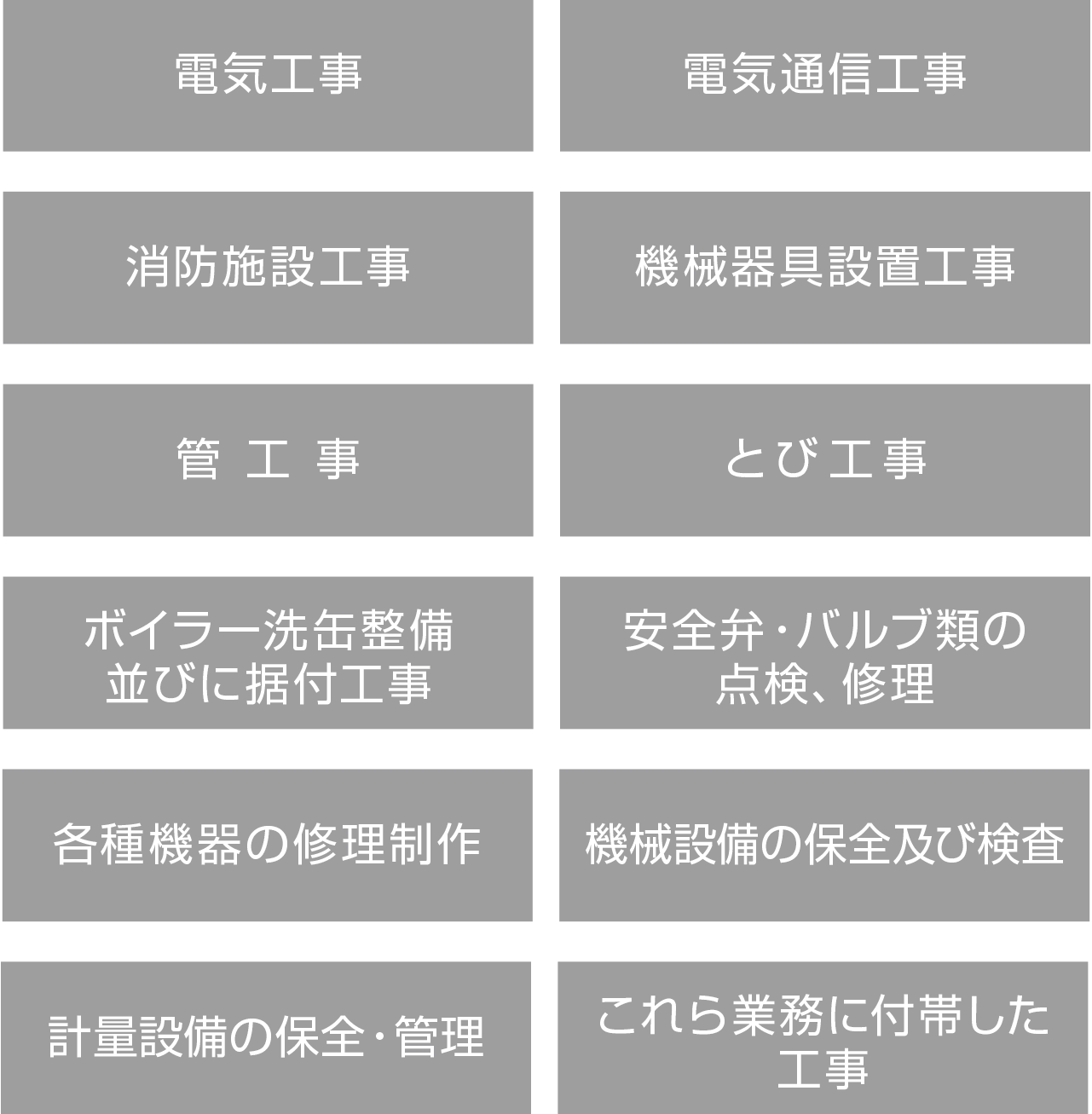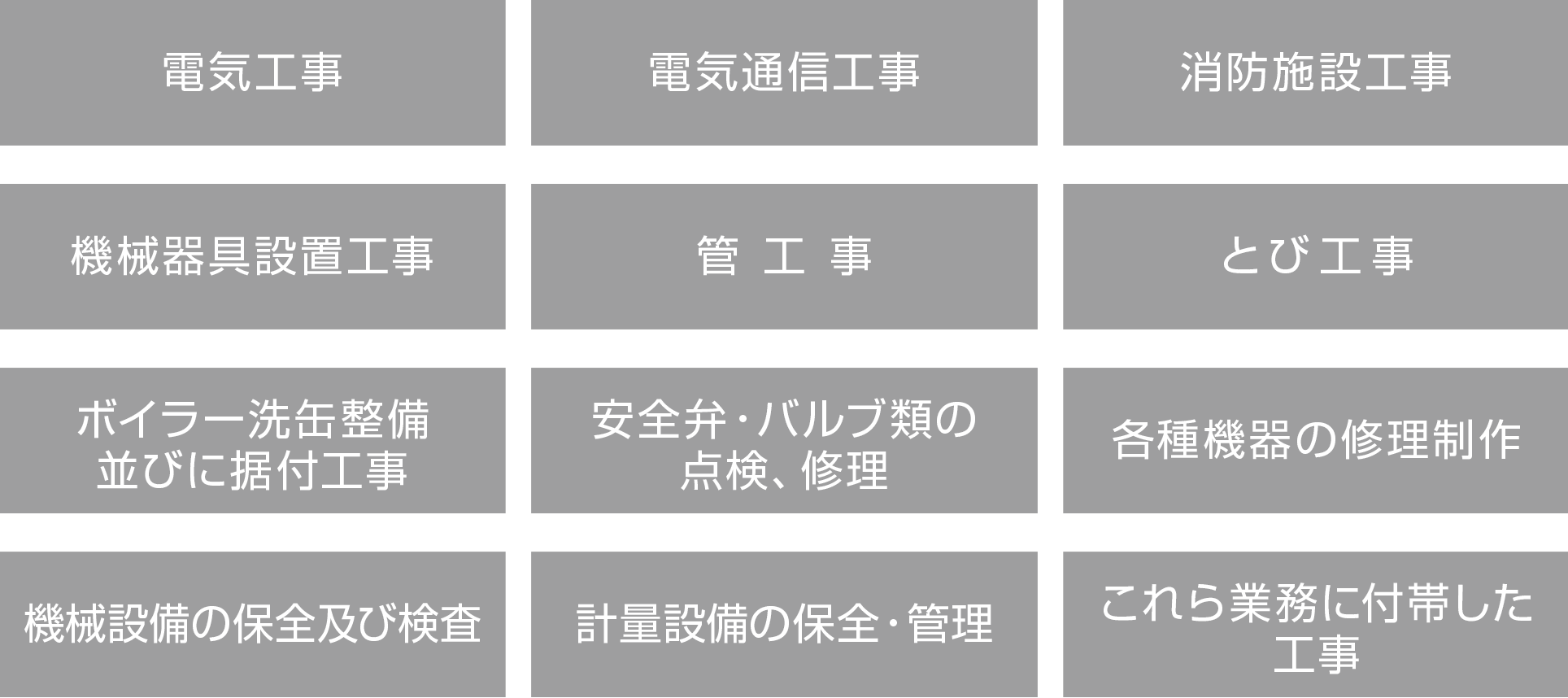 信越化学、 関連グループおよび上越地域において電気、 電気通信、 消防施設工事の設計施工を行います。また、 電気設備補修工事、 電気設備点検、 消防設備保守・点検、 故障時の修理対応を行います。